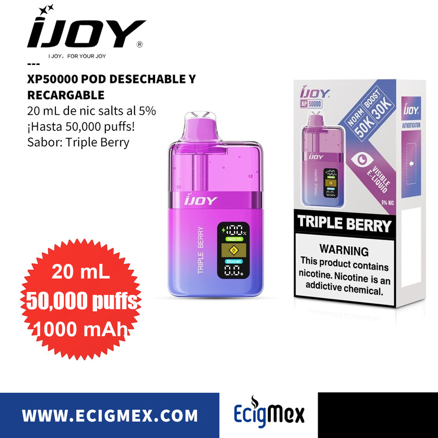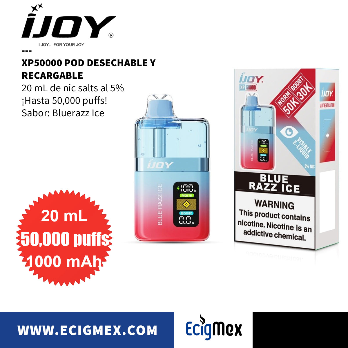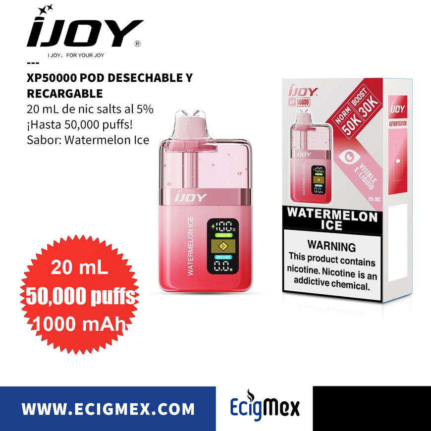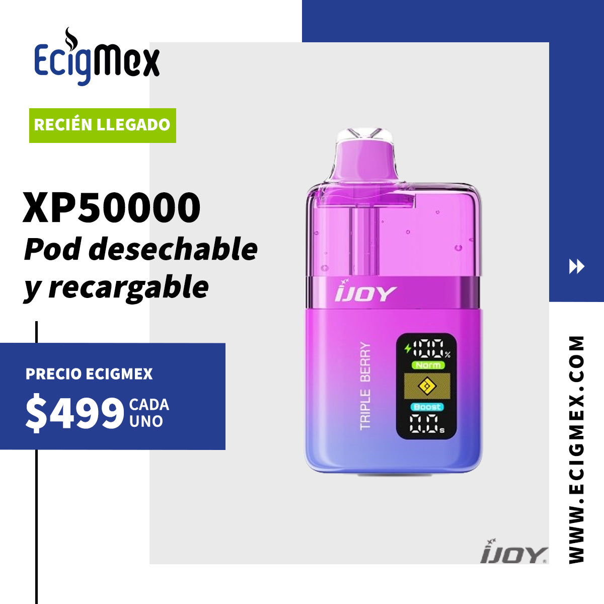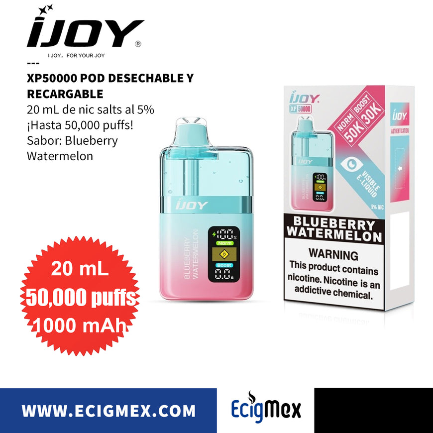 Llega el nuevo POD desechable de la serie iJoy, el iJoy XP50000, un vaporizador de larga duración con hasta 50,000 puffs en modo NORMAL y 30,000 en modo BOOST. Diseño tipo box mod de ultima generación con una boquilla ergonómica que será tu mejor opción. Alimentado por una batería de 1000 mAh con carga Tipo-C y 2 modos de vapeo: Normal y Boost. Adicionalmente, es el primer pod desechable con tanque transparente para ver la cantidad de e-juice, doble Mesh coil de 0.4 ohms y una pantalla que te brindara toda la información de la batería y carga de líquido.